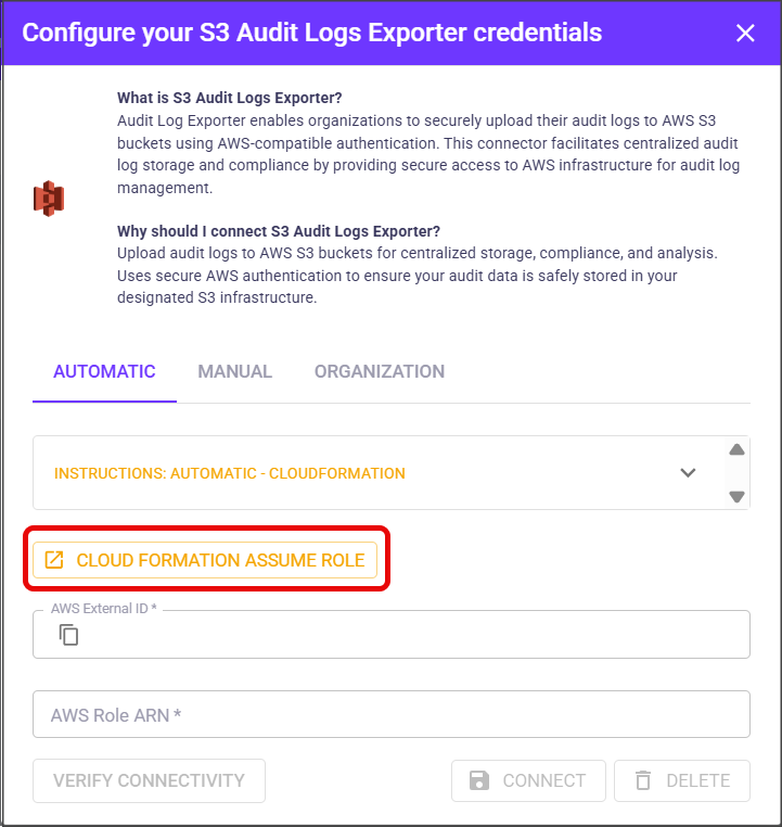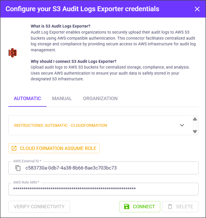 Audit log export uses an AWS role-based connector. During the setup, OX generates a unique external ID and uses an AWS IAM role, which is created in AWS with permission to write to the specified S3 bucket. The role ARN and external ID are used together to securely authenticate export operations.