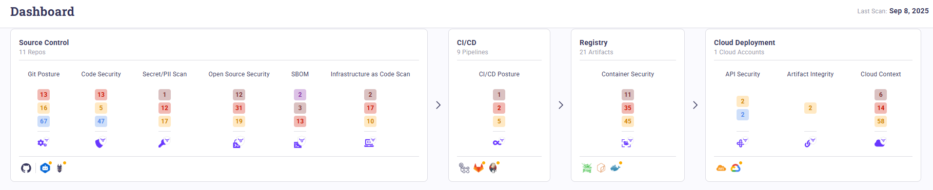 | **Code Security** (SAST, IaC Scan, Secrets, SBOM, Open Source Security) | Source control (required)                    | Scans code for vulnerabilities, secrets, IaC misconfigurations, license risks, dependency issues, and generates SBOMs. | No code-level visibility.                          |