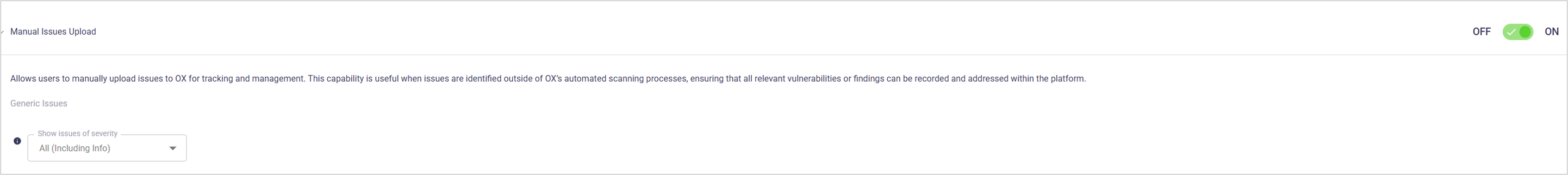 Manual Upload policies support tracking of security issues identified outside of automated scanning. The policy enables teams to record and store external findings in OX.